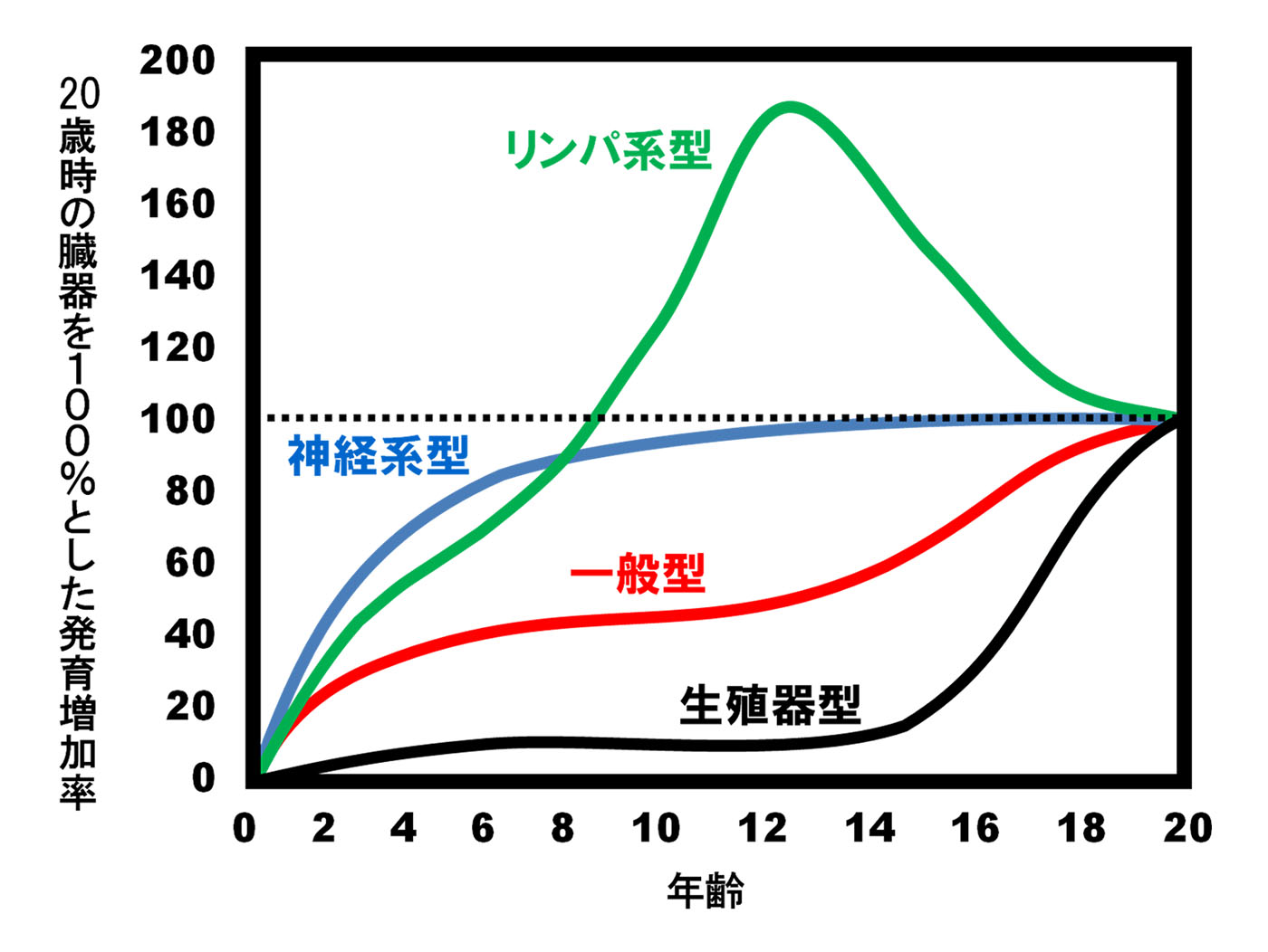 器⽤さやリズム感を担う神経系の発達は脳の重量や頭囲で計る。出産直後から急激に発達し、4~5歳までには成⼈の80%程度(6歳で90%)にも達する。
